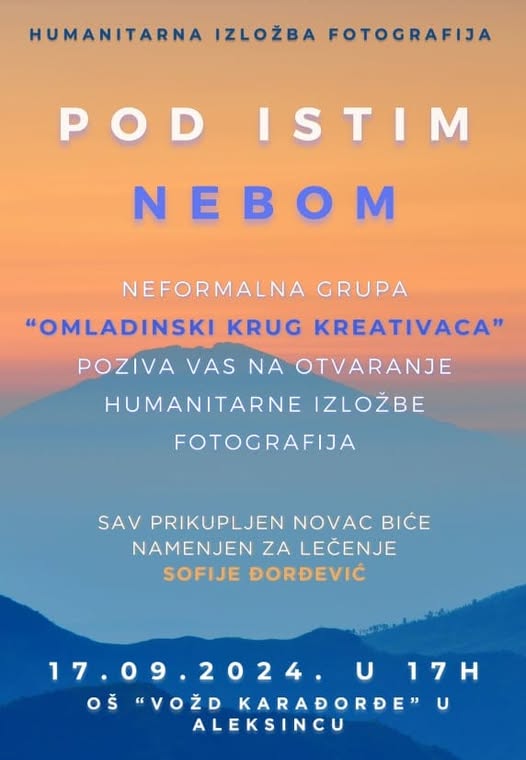 У уторак, 17. септембра 2024. године, у сарадњи Омладинског круга креативаца, Dream Studio и Основне школе „Вожд Карађорђе” из Алексинца, организована је хуманитарна изложба фотографија под називом „Под истим небом”, са циљем да се помогне малој Софији.